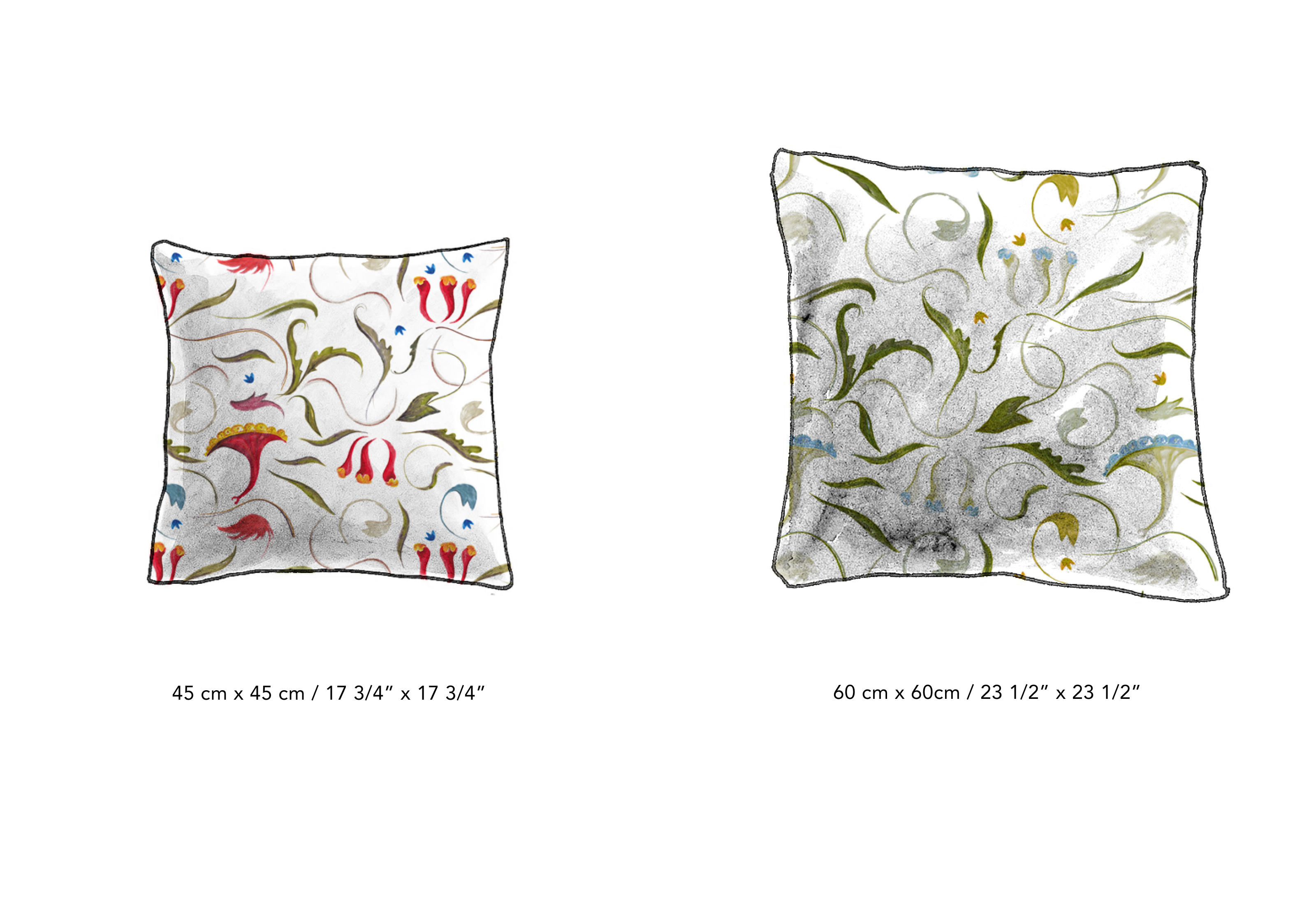 We offer made-to-order cushions using our full range of original textile designs. We currently offer two standard sizes, with custom sizing available on request. Each cushion is supplied with a pure feather insert unless otherwise specified.