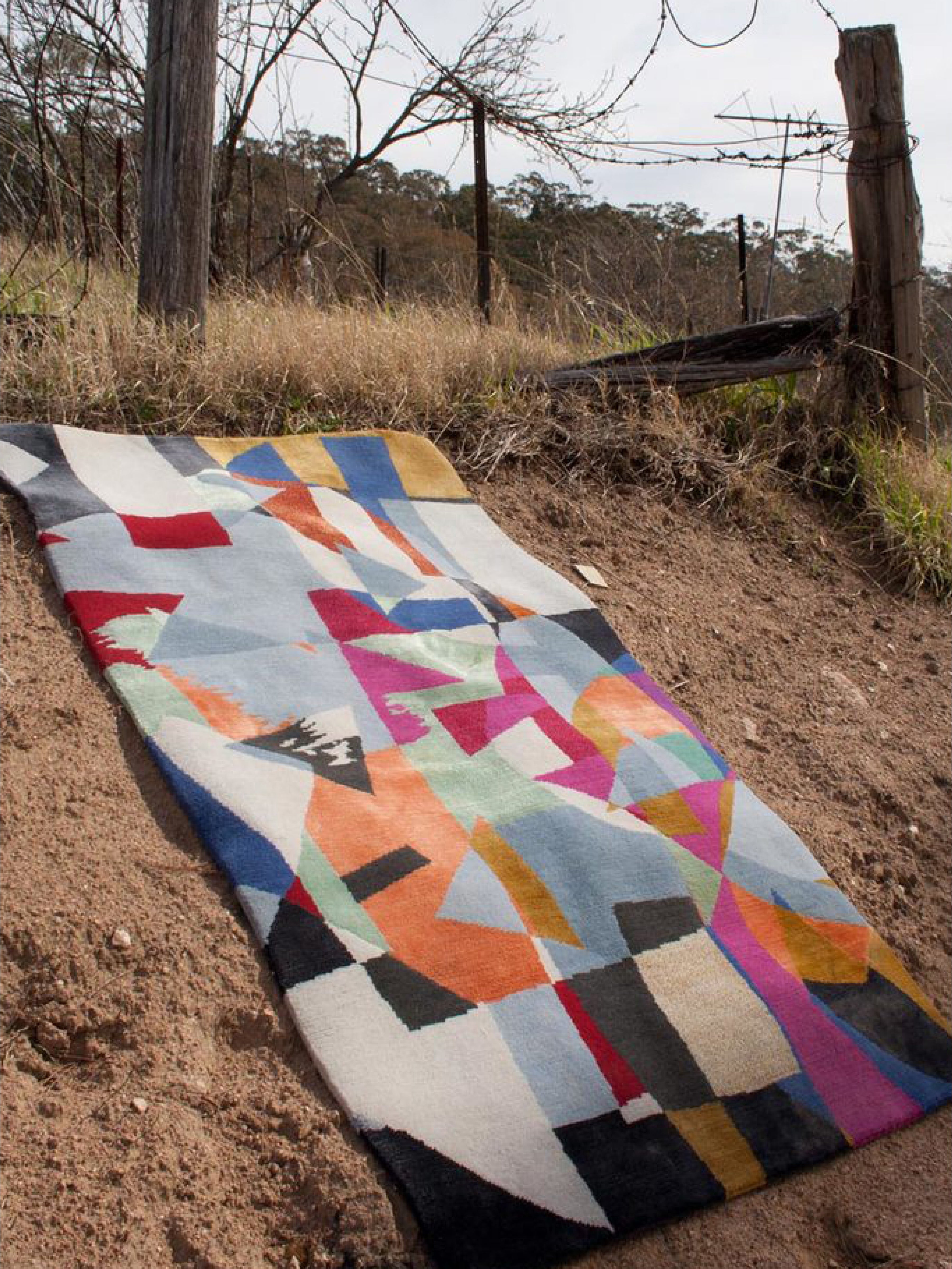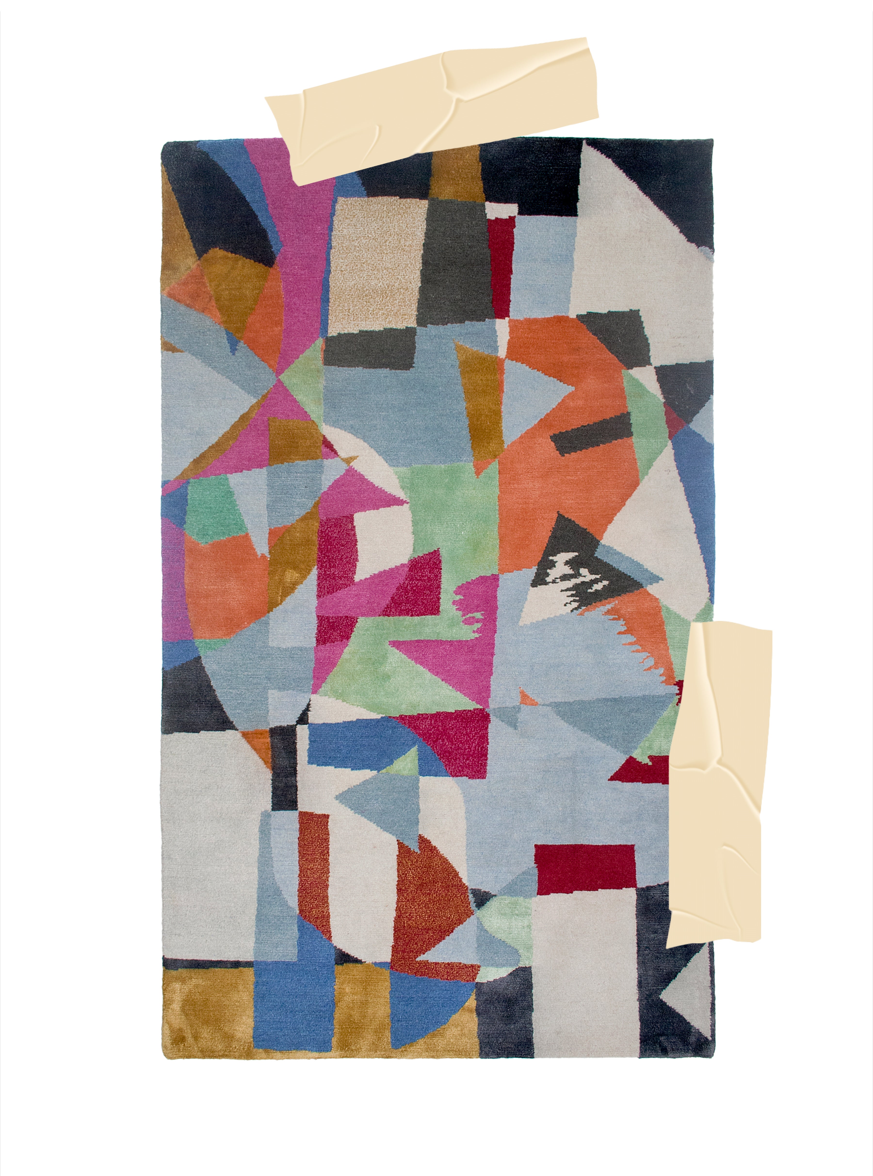 Bold geometric forms in vivid magenta, lilac, burgundy, and lemon yellow cascade across a ground of soft ivory, creating a rhythm of light and structure. Inspired by modernist collage and the spatial play of Bauhaus-era textiles, this hand-knotted rug balances spontaneity with precision.