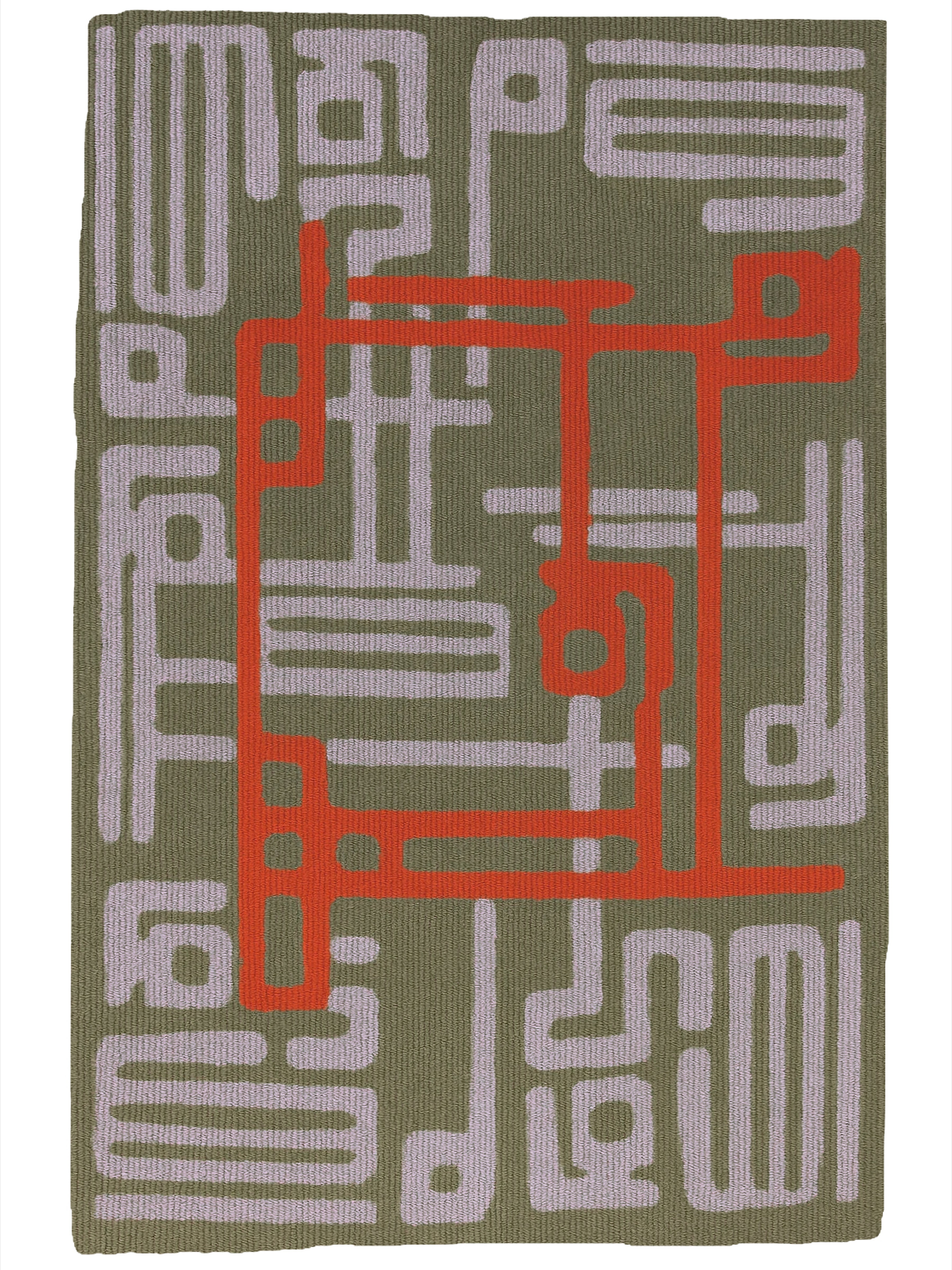 A striking fusion of modernist geometry and Eastern calligraphic influence, Shanghai is a handwoven kilim crafted from natural yarns. Its bold linear composition draws inspiration from architectural grids and the rhythmic flow of Chinese seal script, reimagined in a contemporary palette of khaki green, warm silver and vivid vermilion.