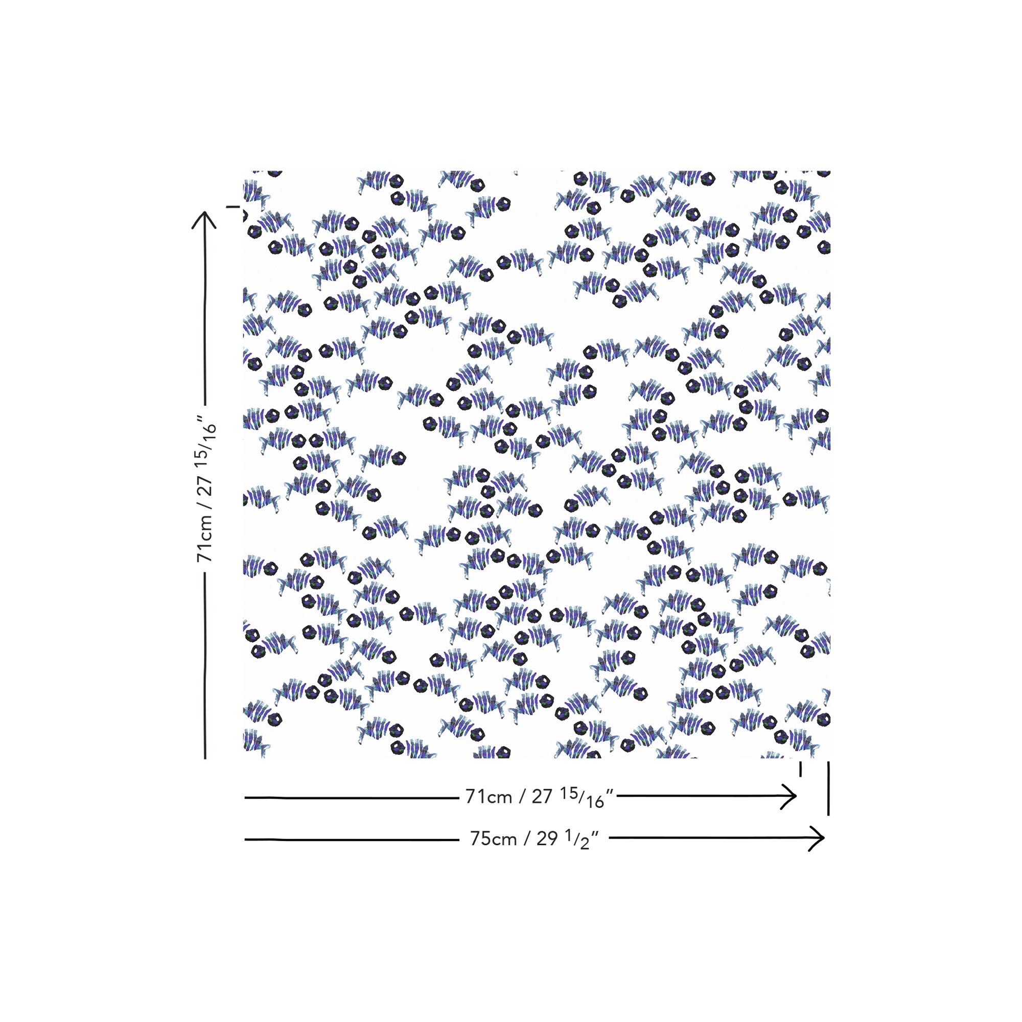 Hand-crafted from torn paper collage, a lively school of fish drifts across the surface. Their striped bodies are assembled from fragments of indigo, violet, and blue, each form slightly irregular and scattered at varying angles. The fish create the impression of playful movement — a composition that celebrates both the spontaneity of collage and the fluidity of the sea.