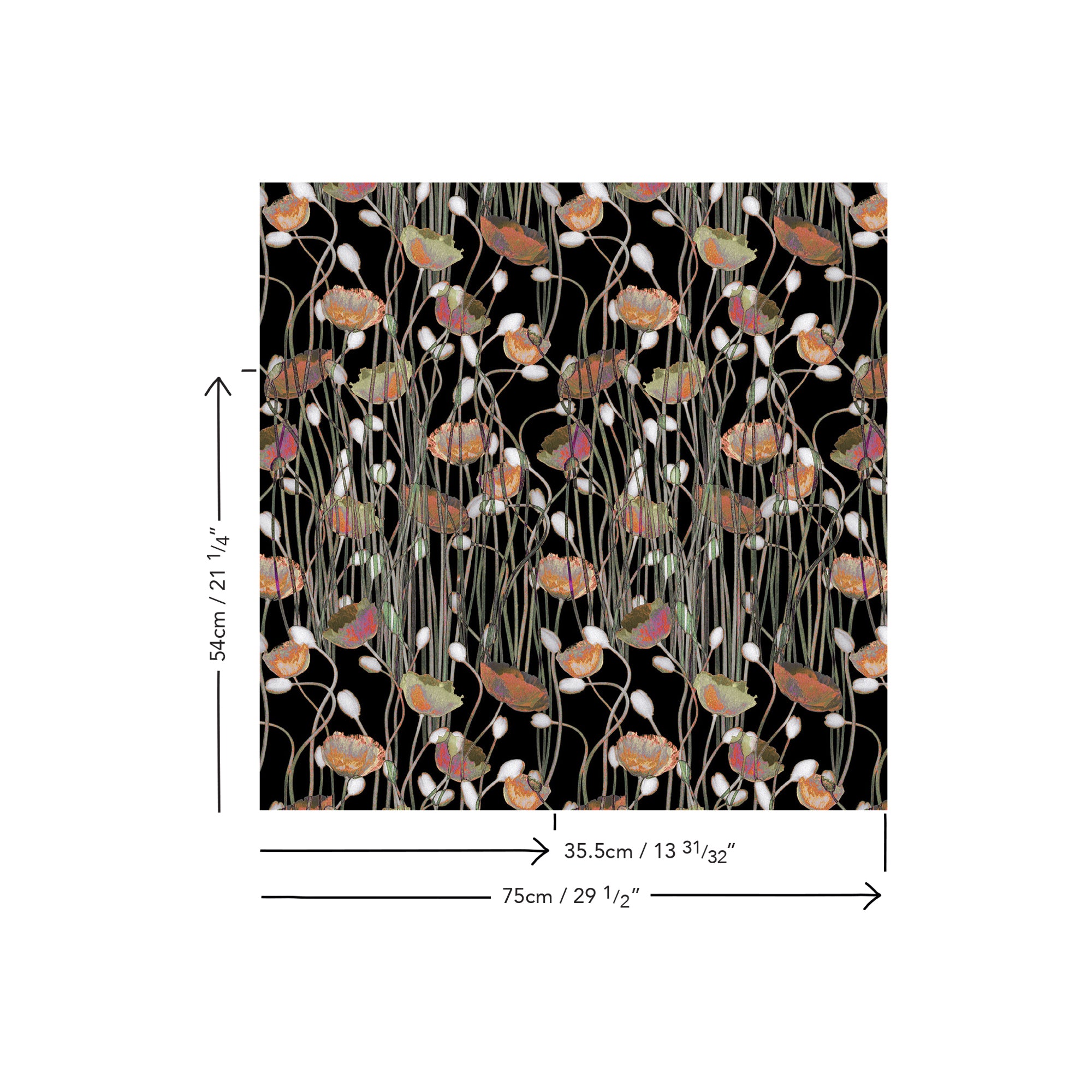 Poppies rise on slender, wandering stems, their petals washed in shifting tones. Some bloom boldly, others fade into translucence, as if dissolving in light. Dark pods scatter through the tangle, like quiet punctuation in a field alive with rhythm, a fleeting moment of nature captured in pattern.
